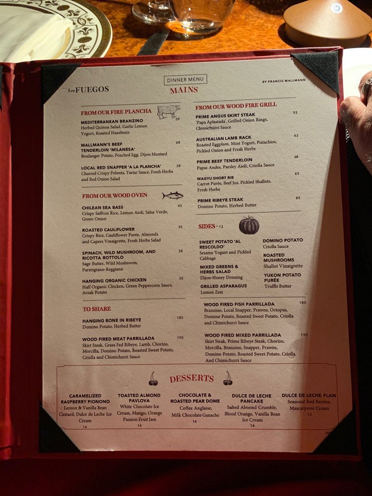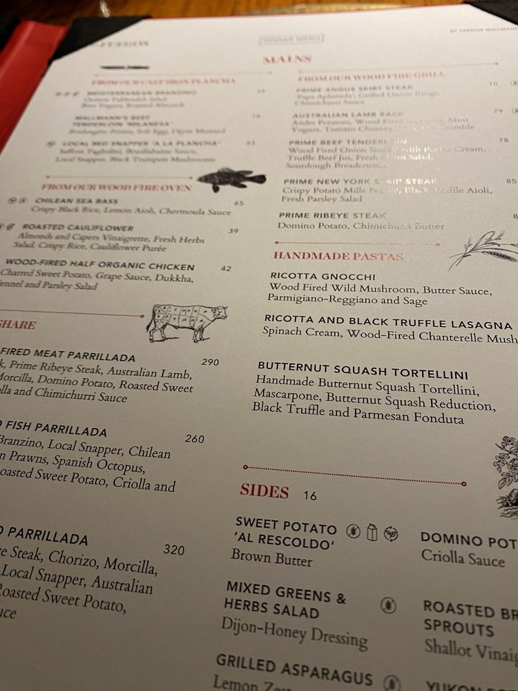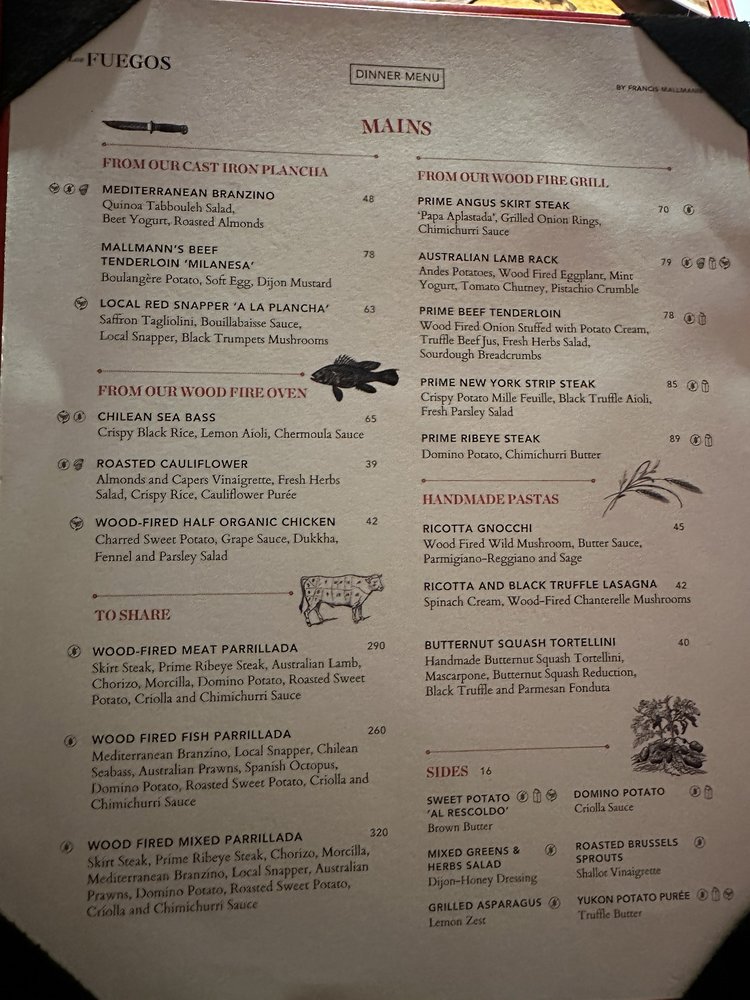 Skirt Steak, Prime Ribeye Steak, Chorizo, Morcilla, Mediterranean Branzino, Local Snapper, Australian Prawns, Domino Potato, Roasted Sweet Potato, Criolla and Chimichurri Sauce