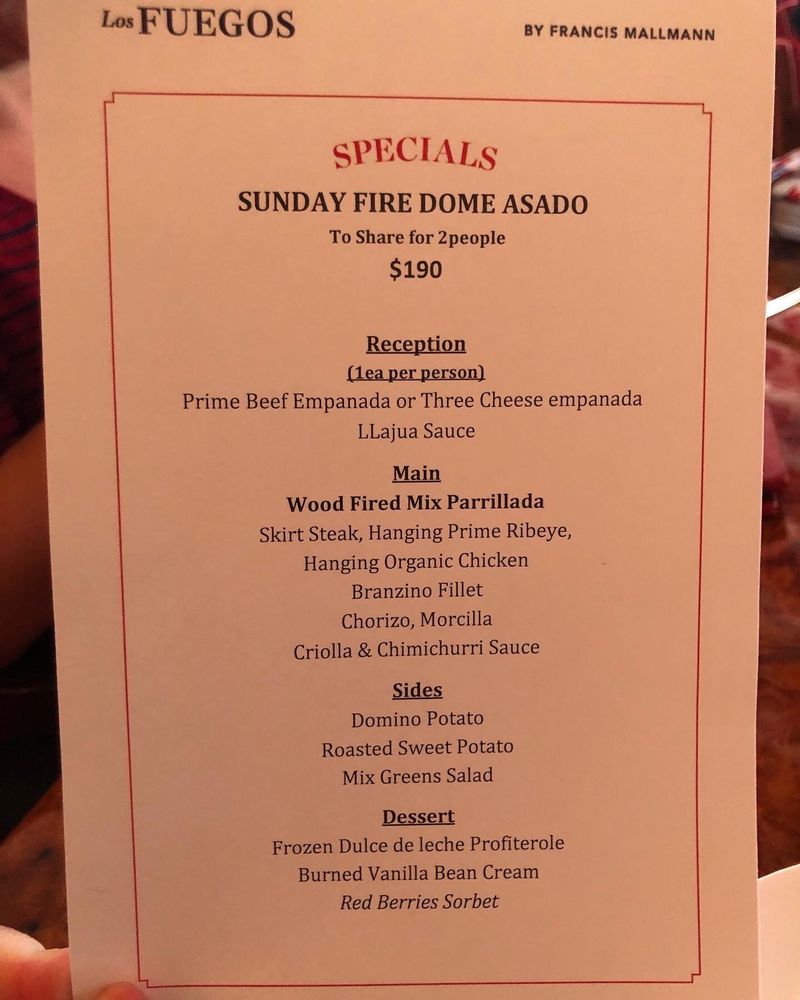 Introducing Los Fuegos by Francis Mallmann, a Latinx-owned steakhouse located at 3201 Collins Ave in Miami Beach, FL. This upscale and romantic restaurant offers a variety of options, from vegan to limited vegetarian dishes. With amenities like outdoor seating, free Wi-Fi, and valet parking, Los Fuegos provides a classy dining experience suitable for all occasions. The menu is curated by renowned chef Francis Mallmann, promising a unique and flavorful culinary adventure. From savory steaks to delectable desserts, each dish is crafted with precision and passion. The restaurant's ambiance, impeccable service, and attention to detail make it an ideal choice for a memorable dining experience in Miami Beach. Visit Los Fuegos for a taste of Latin-inspired cuisine that will leave you craving for more.